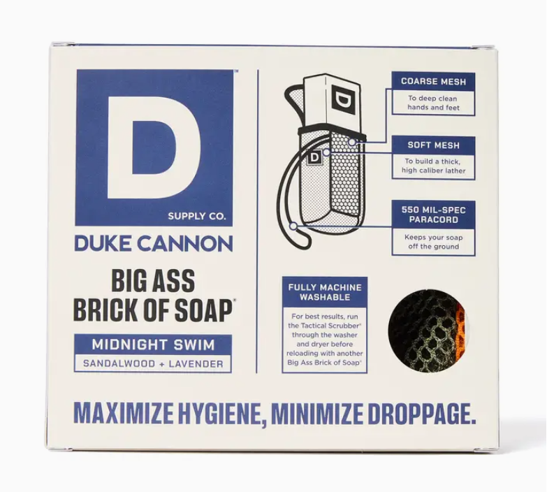 This package includes both our Tactical Scrubber Pouch and our Big Ass Midnight Swim Soap so you have the essentials tools to never again drop your soap. A window in the back shows exactly what's inside. This convenient bundle package provides a simple, all-in-one solution.