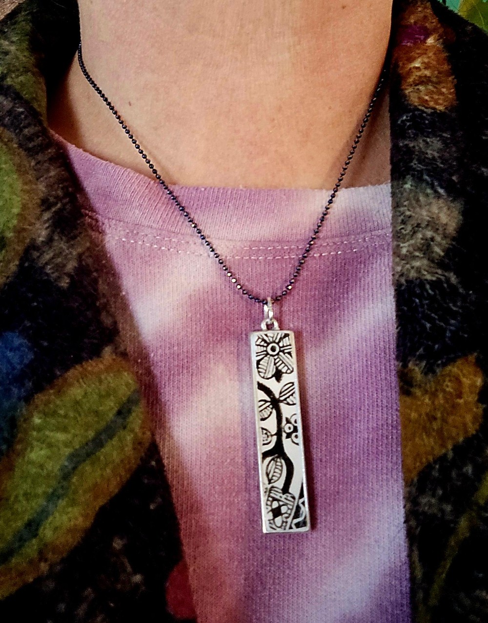The necklace I am offering to wear this piece is a 16" black faceted ball chain with lobster claw clasp + 3" extender chain.