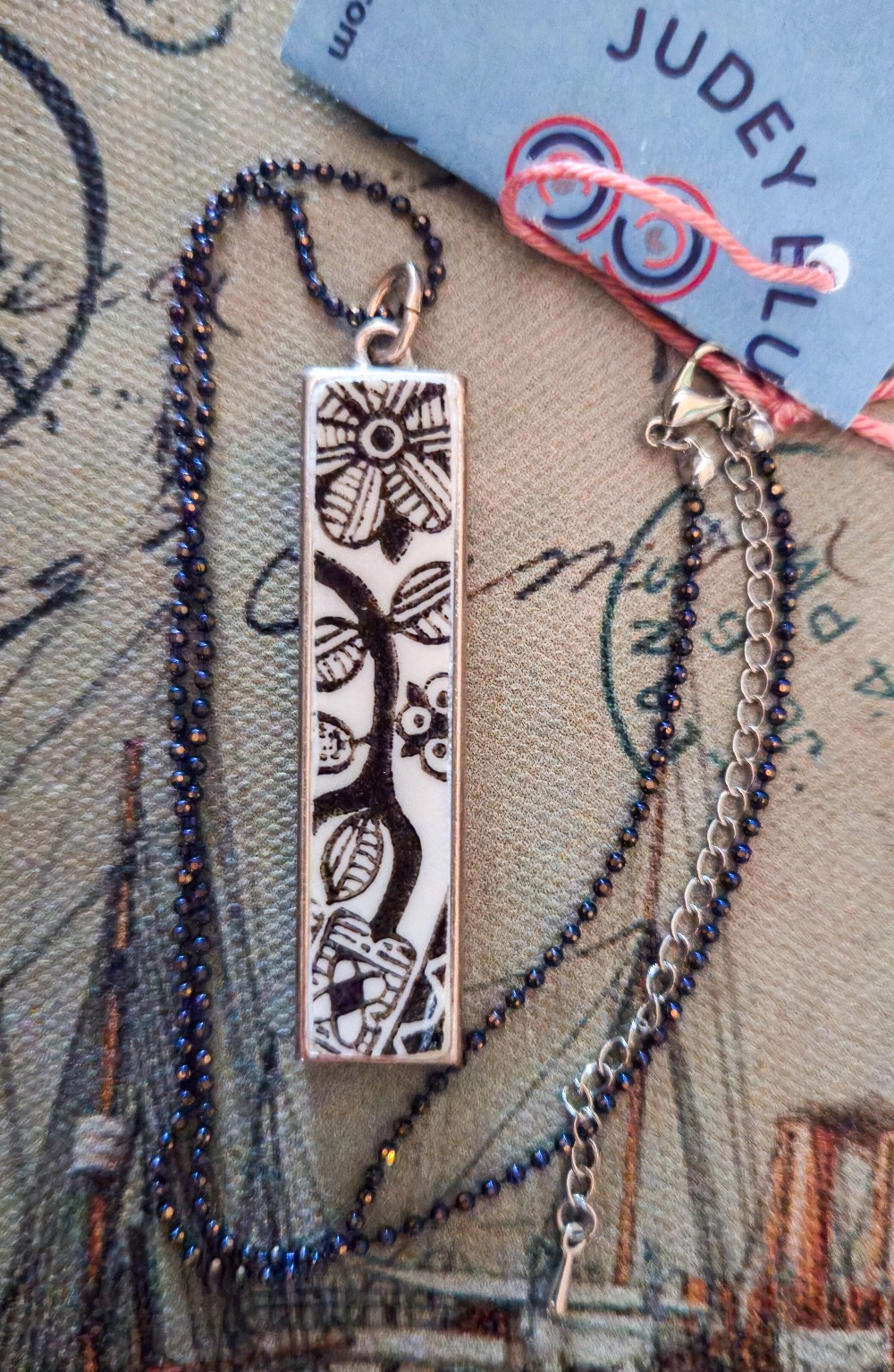 I have lovingly placed the porcelain piece into an antiqued silver plated brass rectangular setting that measures just under 2" long x just under 1/2" wide.