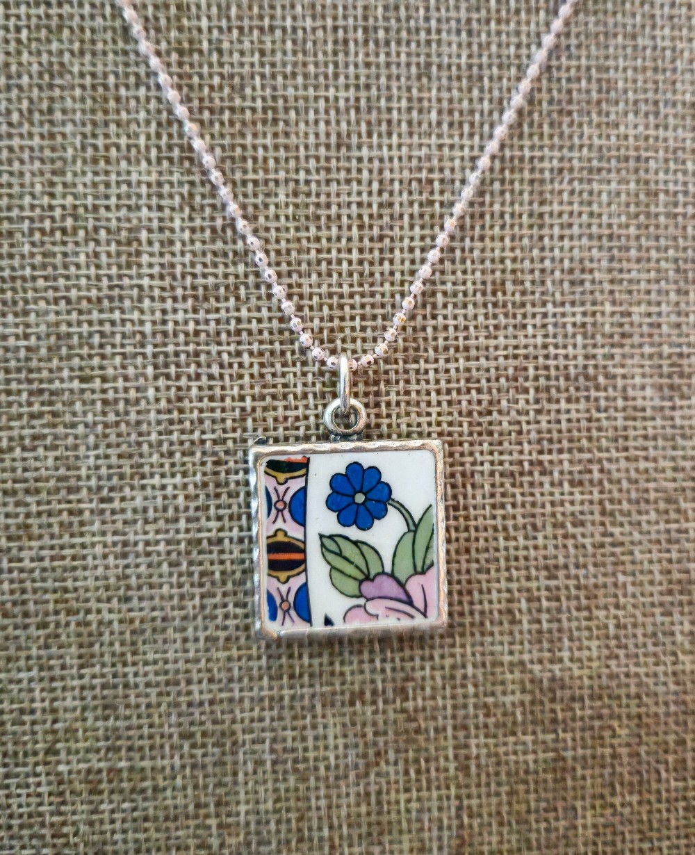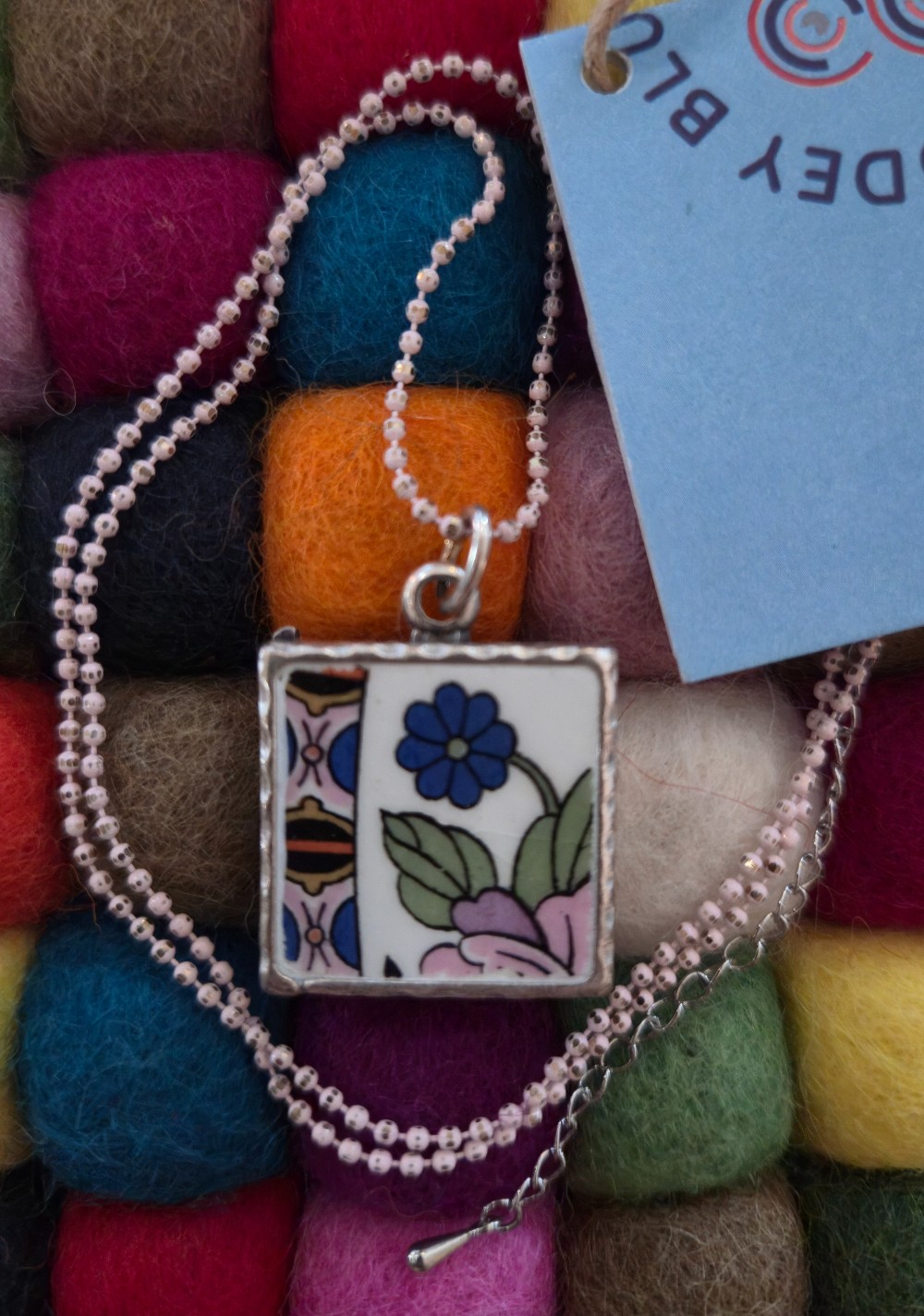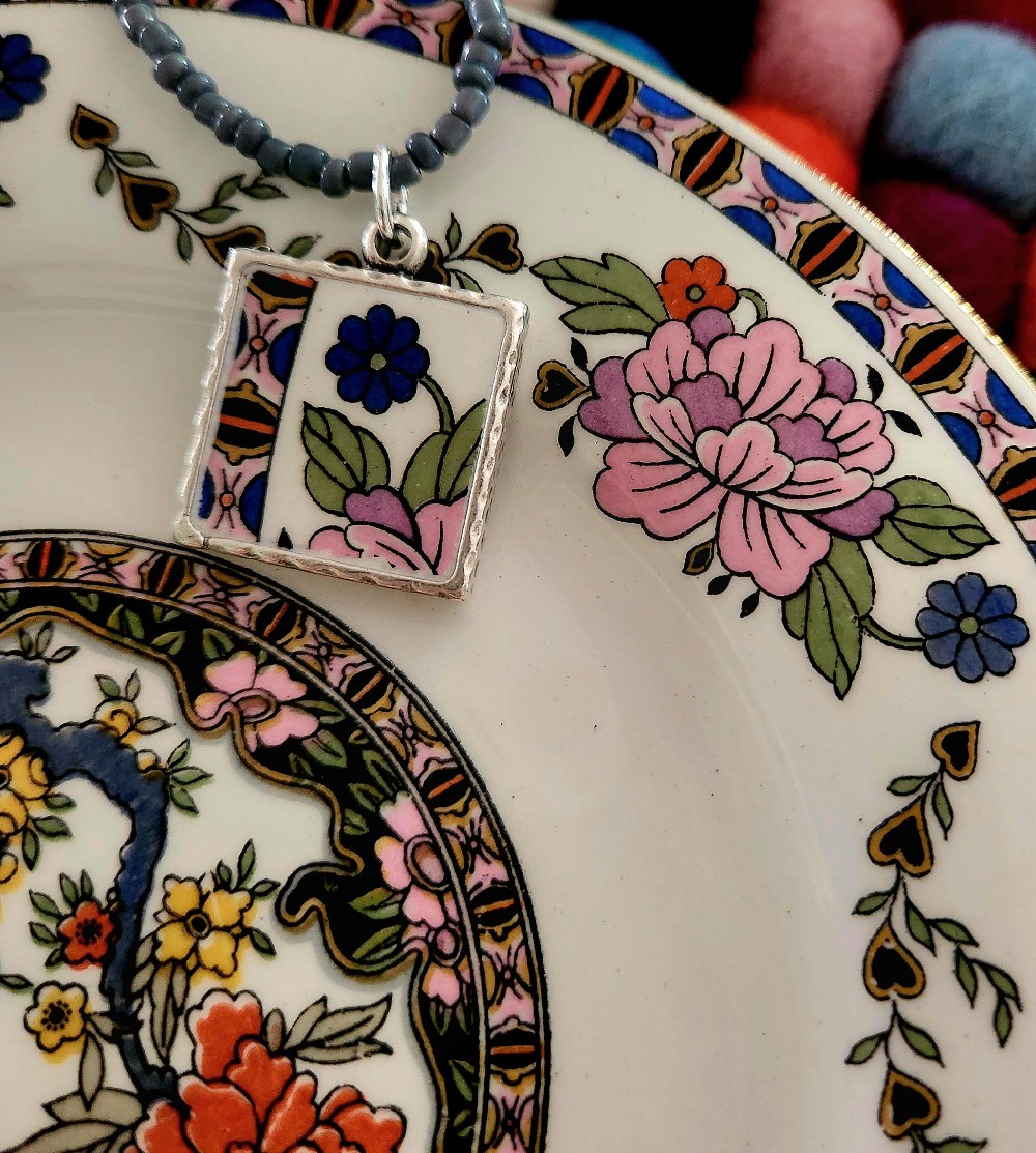 The design for this pendant was chosen from the bread plate, carefully cut out with ceramic tile nippers, smoothed out to size & shape with my handy dandy grinder, then (white) grout was added to the edges to seal & further protect the vintage china piece.
