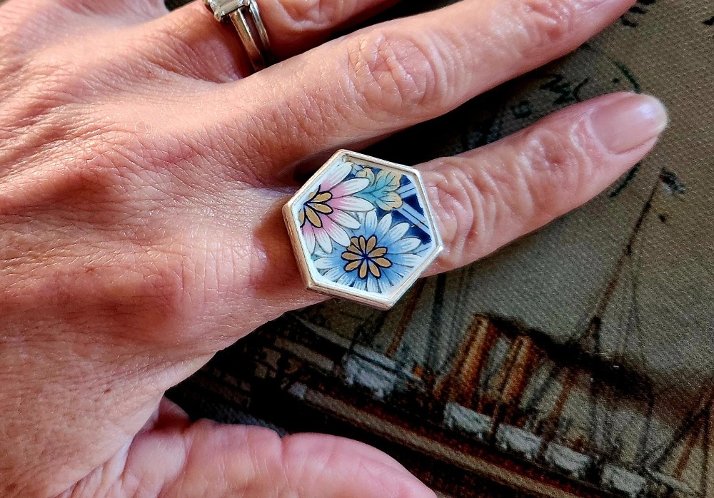 The design for this ring was chosen from the plate, cut out carefully with ceramic tile nippers, smoothed out to size & shape with my handy dandy grinder, then (white) grout is applied to the edges to seal & further protect the vintage china.