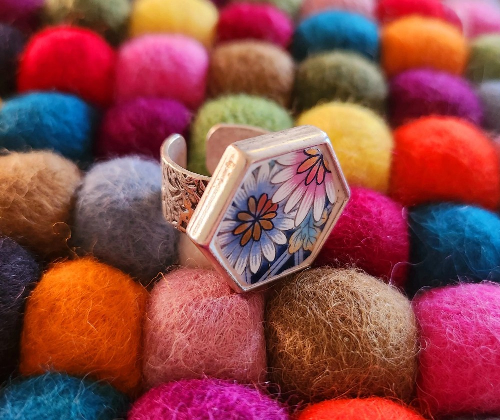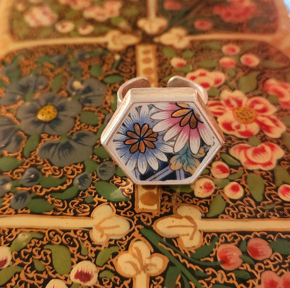 This uniquely fabulous vintage china adjustable ring was created from a stunning Japanese Imari collector's plate! Imari is a porcelain design style that was inspired by 17th century Japanese Imari Porcelain who took their design cues from the colorful Japanese textiles of the day.