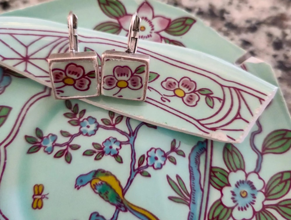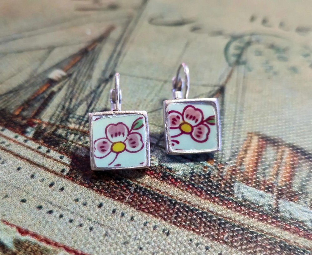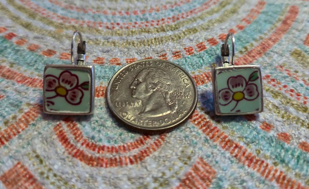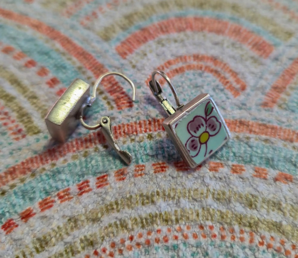 I have lovingly placed the porcelain pieces into fantastic antiqued silver plated brass square earring settings that measure just under 1/2" square & the earring part is hinged earwire.