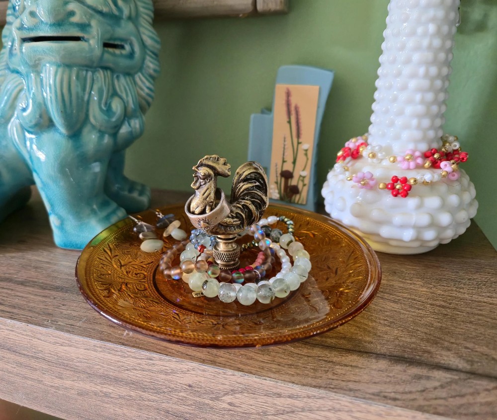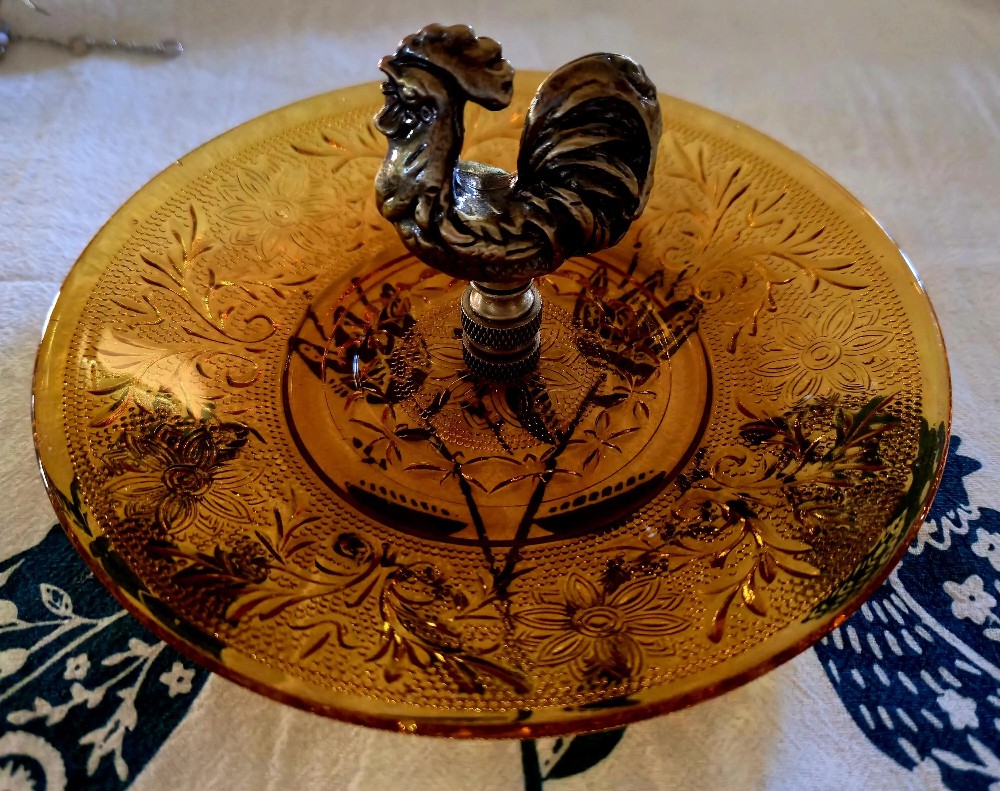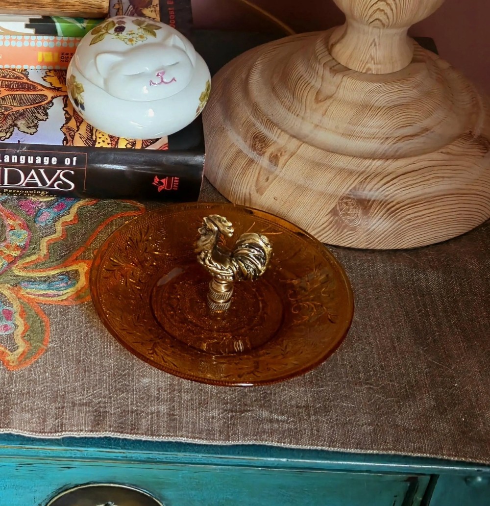 Vintage "Sandwich Amber" bread plate by Indiana Glass Company ~ lovely amber Depression Glass with the design depicting beautiful flowers & scrolls upcycled / repurposed into a beautiful jewelry holder / trinket dish by adding a super fabulous chicken lamp finial to the center to hold a ring or whatever you would like! This super cool pattern was first produced in 1925 & was discontinued in 1985.