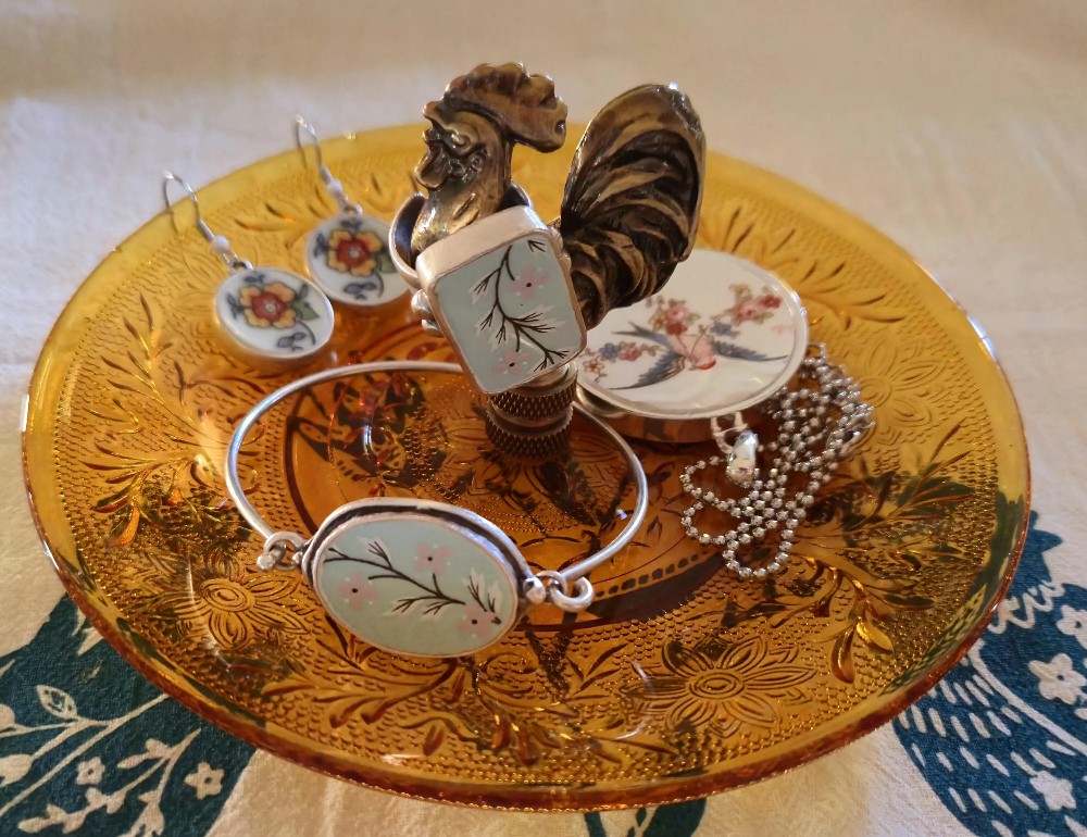 The trinket dish measures 6" in diameter & the chicken stands 2.75" tall.