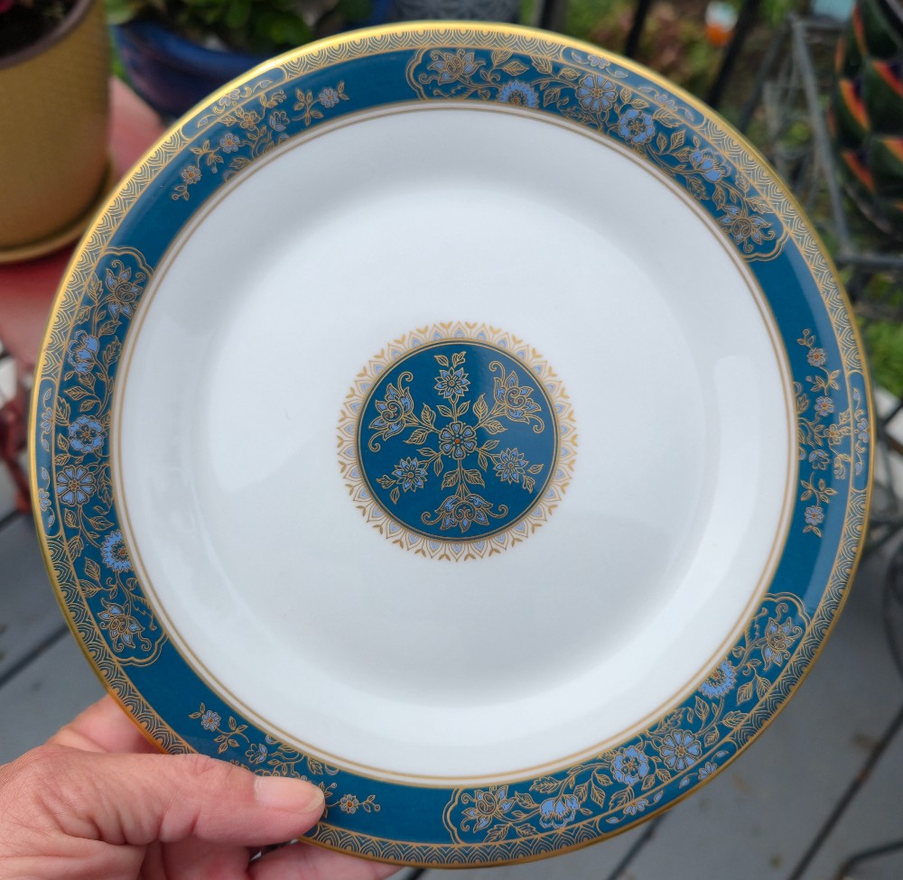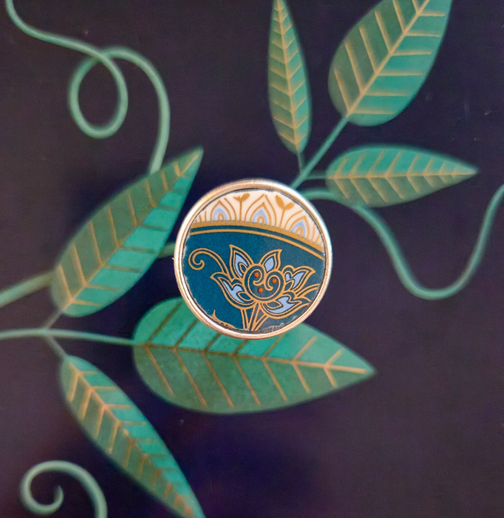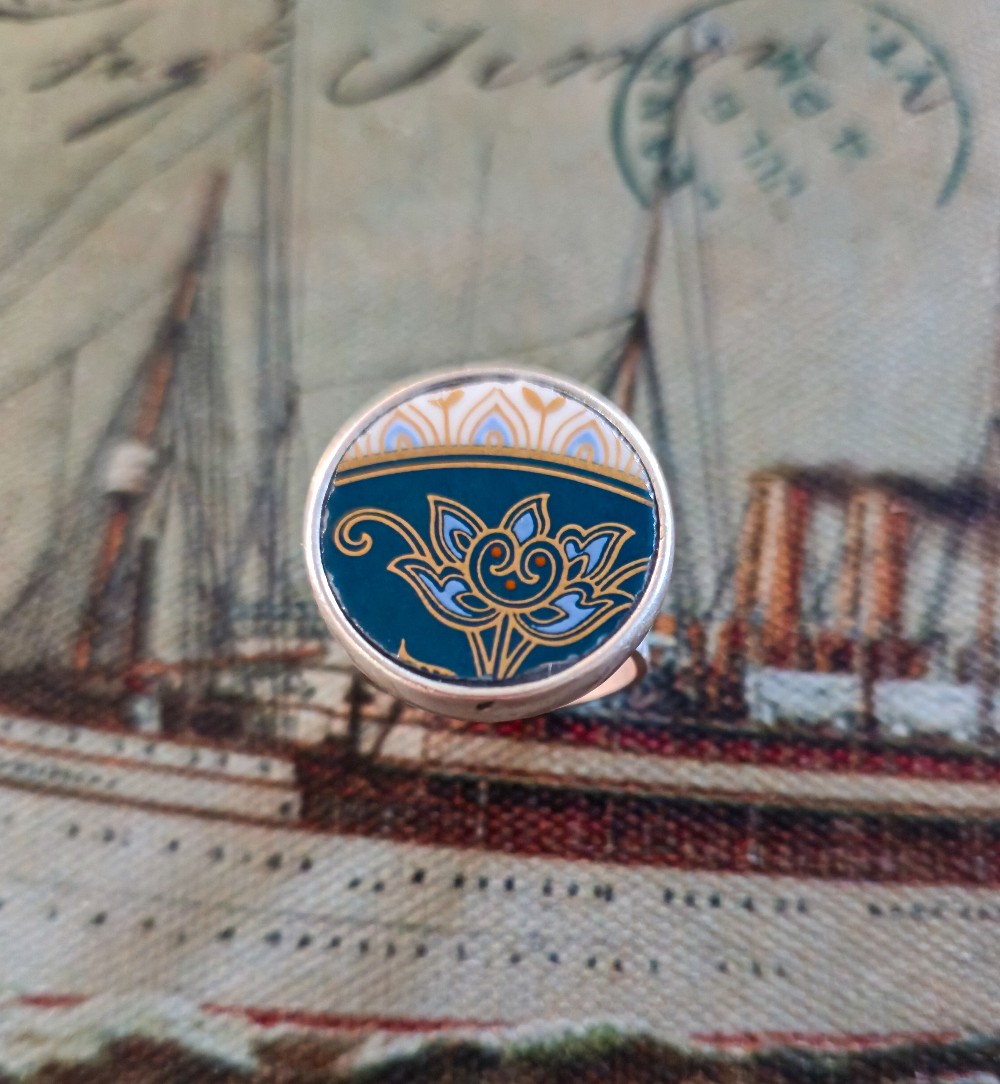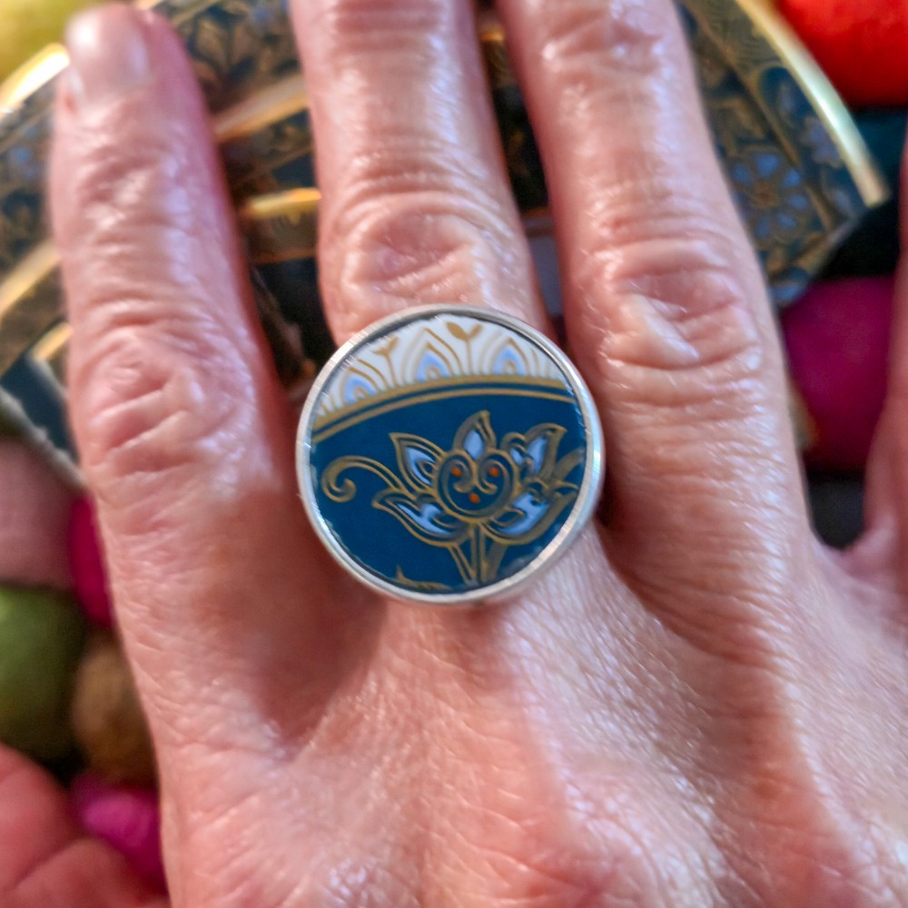 This gorgeous vintage china adjustable ring has been created from a beautiful "Carlyle" dinner plate by Royal Doulton which features a deep cobalt blue border with intricate turquoise & gold scrollwork, a central medallion & gold trim. The "Carlyle" pattern (H5018) was produced by Royal Doulton from 1972 - 2001 & it was produced in England of fine bone china.