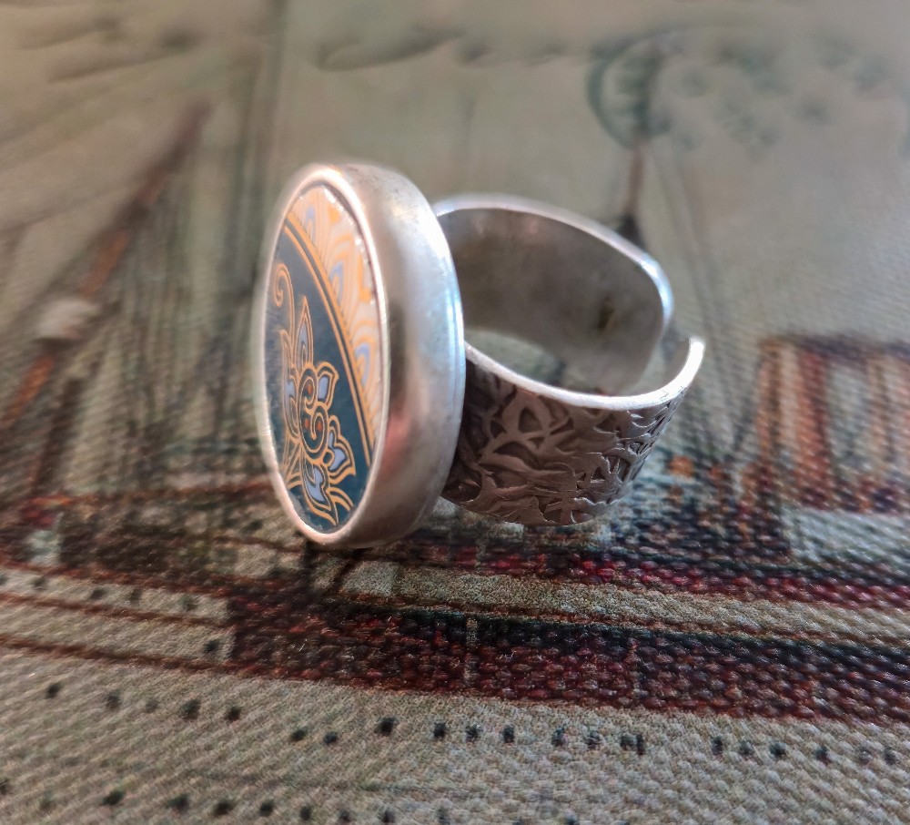 The design for this stunning ring was chosen & cut out with ceramic tile nippers, smoothed out to size & shape with my handy dandy grinder, then (black) grout is added to the edges to seal & further protect the vintage china pendant.