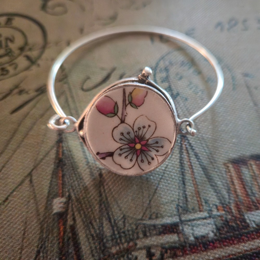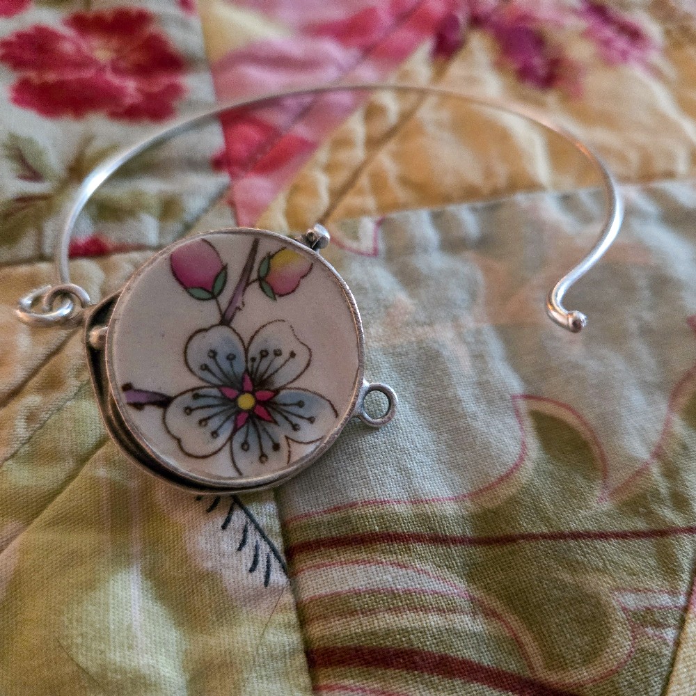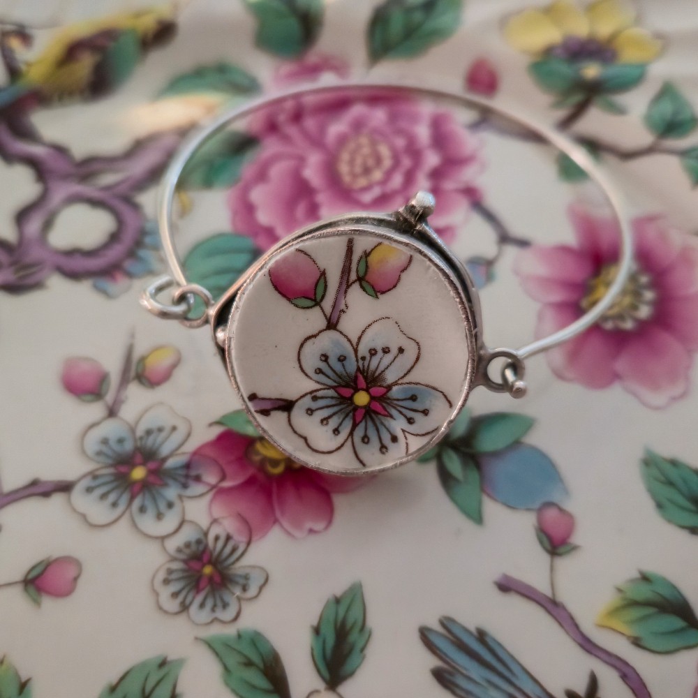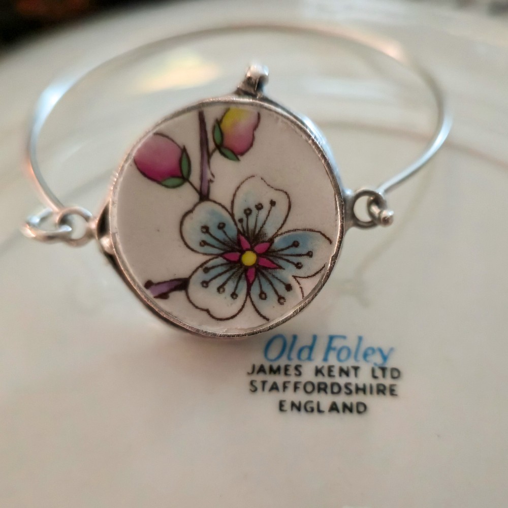 This uniquely fabulous vintage china antiqued silver bangle bracelet was created from a gorgeous James Kent "Chinese Rose" pattern dinner plate. This fantastic pattern features a detailed design of pink, blue & yellow flowers with colorful birds on branches with a scalloped, slightly upturned edge with a green trim. “Chinese Rose” was produced by James Kent at the Old Foley Pottery in Staffordshire, England from 1940-1959.