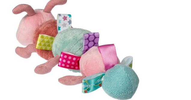 Camilla is the perfect cuddly caterpillar for little ones! Made with the softest materials and features beautiful shades of pink, coral, and soft greens. Taggies ribbons provide an extra sensory experience for baby to explore and engage with.