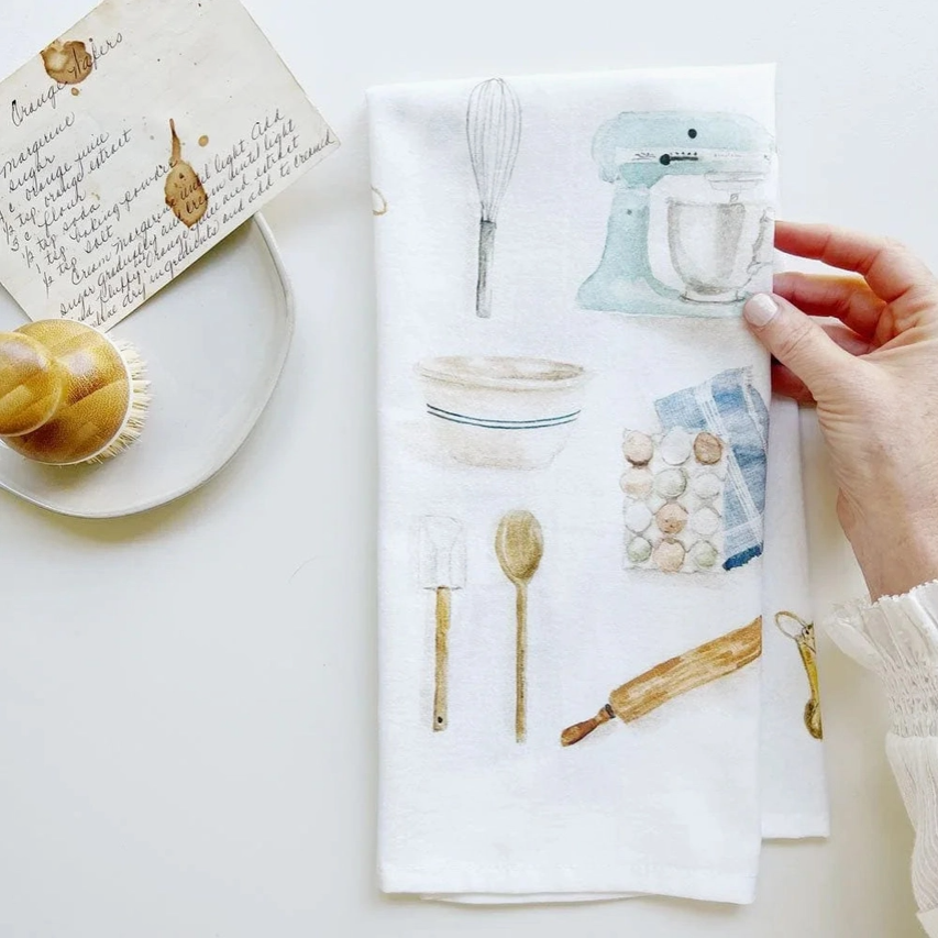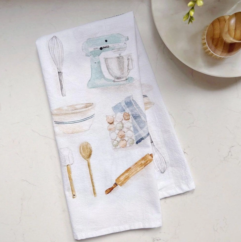 Add a touch of delight to your kitchen with this 100% cotton tea towel. Baking illustrations cover the towel making it perfect for washing up, lining a basket, or displaying. Pair with a favorite cookbook, fancy sea salt, or a set of wooden spoons for the perfect baking-inspired gift!